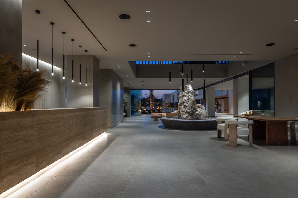 The use of warm, focused lighting in combination with natural textures underscores both intimacy and sophistication. At the same time, it enhances the clarity of the hotel’s modern architectural lines, ensuring that functionality is always paired with aesthetic quality.